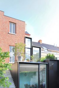 La vivienda del siglo XIX está situada en un cruce muy concurrido en la circunvalación de Gante. En el lado de la calle, la casa
